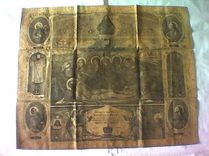 In many Eastern Christian liturgical traditions, the antimension (Greek "instead of the table") is one of the furnishings of the altar. It is a rectangular piece of cloth of linen or silk, typically decorated with representations of the entombment of Christ, the four evangelists, and scriptural passages related to the Eucharist. A small relic is sewn into it. It is unfolded on the altar before the Anaphora, and the Eucharist is consecrated on it. The antimension must be consecrated and signed by the bishop, indicating his permission for the Eucharist to be celebrated in his absence. It is, in effect, the church's license to hold divine services.