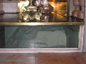 The altar at Golgotha. Pilgrims are bowing down to kiss the star which marks the traditional spot where the Cross of Jesus was planted.