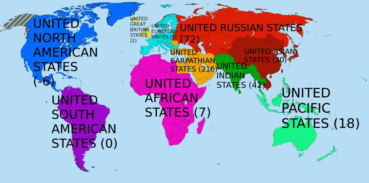 Carpathia divides the world into ten regions: the United North American States, the United European States, the United Carpathian States (Middle East; before events in The Indwelling it was called the United Holy Land States), the United Asian States, the United South American States, the United Russian States, the United Indian States, the United Pacific States, the United African States, and the United Great Britain States. This partitioning eventually comes into play as ten sub-potentates are given control over each region, representing the ten kings prophesized in the Book of Revelation. Each region is assigned a code number, which is to be the marking used for the loyalty mark system established by Carpathia. (The code is based on a mathematical equation involving three sixes; example: United Carpathian States: 6 x 6 x 6 = 216).