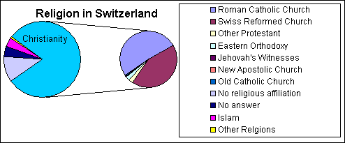 Christianity is the predominant religion of Switzerland. As of 2000, relgious affiliation in Switzerland includes. :